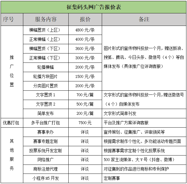 征集碼頭網(wǎng)(m.yf-plastic.com.cn)為國內(nèi)征集競賽服務(wù)平臺,為企事業(yè)單位提供賽事承辦、網(wǎng)絡(luò)推廣、專題定制、投票系統(tǒng)開發(fā)、商標(biāo)注冊等服務(wù);